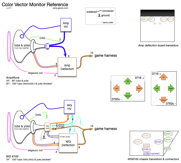 There were two models of color vector displays used by Atari, and this diagram shows the internal connections for both. It also identifies the location of the big transistors used within the monitor board, and which quadrants of the image each transistor is responsible for.