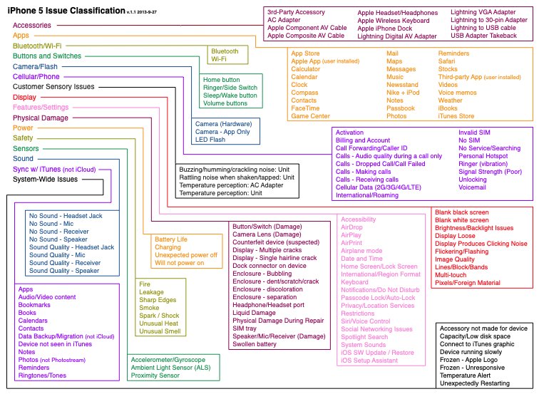 From my days at Apple, this job aid was meant to help support agents quickly classify the specific issue they’d faced during a call. Remembering where a particular endpoint was from among the sixteen root level choices could be difficult. This chart makes every possible choice visible at once, so an agent can quickly scan to find what they are dealing with and then use the colored lines to trace back to the correct initial menu option. Due to the number of choices this chart is very crowded; however, the use of color means the eye does not need to actually follow the tighly spaced lines from box to box.