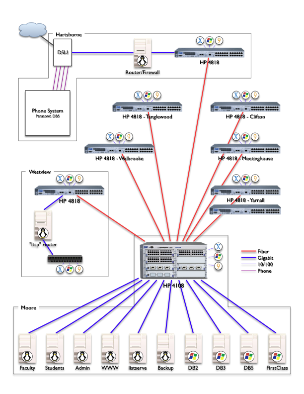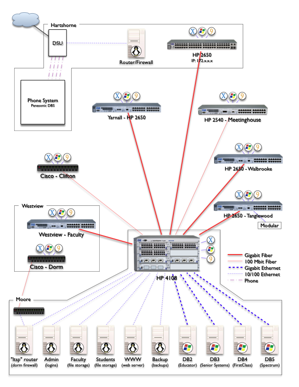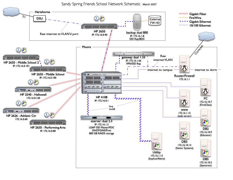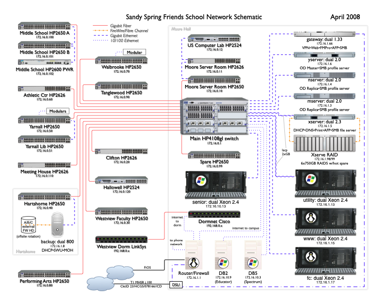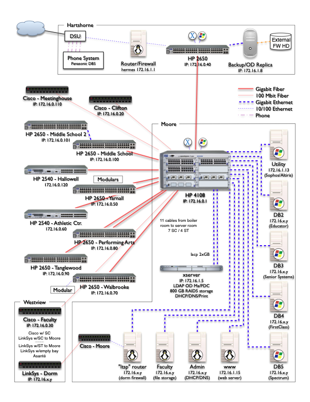 This series of diagrams shows the evolution of the campus-wide fiber optic / Ethernet network and server roster I planned and executed as Director of Technology. Documenting the current state helped in planning and prioritizing upgrades on the path to the ultimate desired state. Being a multi-year process, I updated the diagrams as changes were made. Five of them are below, showing the growth of the network but also continued refinement of the schematic itself.