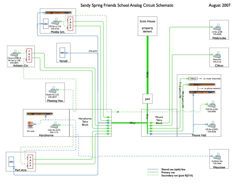 Companions to the network/server schematic, these two diagrams show the VoIP phone system and the plain old telephone system lines and equipment spread over the 11-acre campus. As with the above, I think it is valuable to be able to see the entire system with useful details included and while still fitting on a single, legible page.