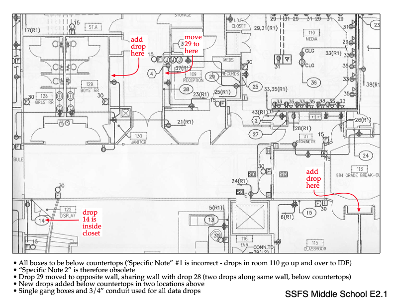 This is a change request document for the Ethernet network design of a new middle school. The bulk of this document is excerpted from building plans, and it is the red text and captions at the bottom that I added. Not at all difficult, but the point is to convey with absolute certainty the changes being requested. This is an exercise in failsafe documentation and accountability. Its purpose is to eliminate any chance of the changes being misinterpreted or overlooked by any of the various parties responsible for construction of the building and installation of the cabling and jacks.