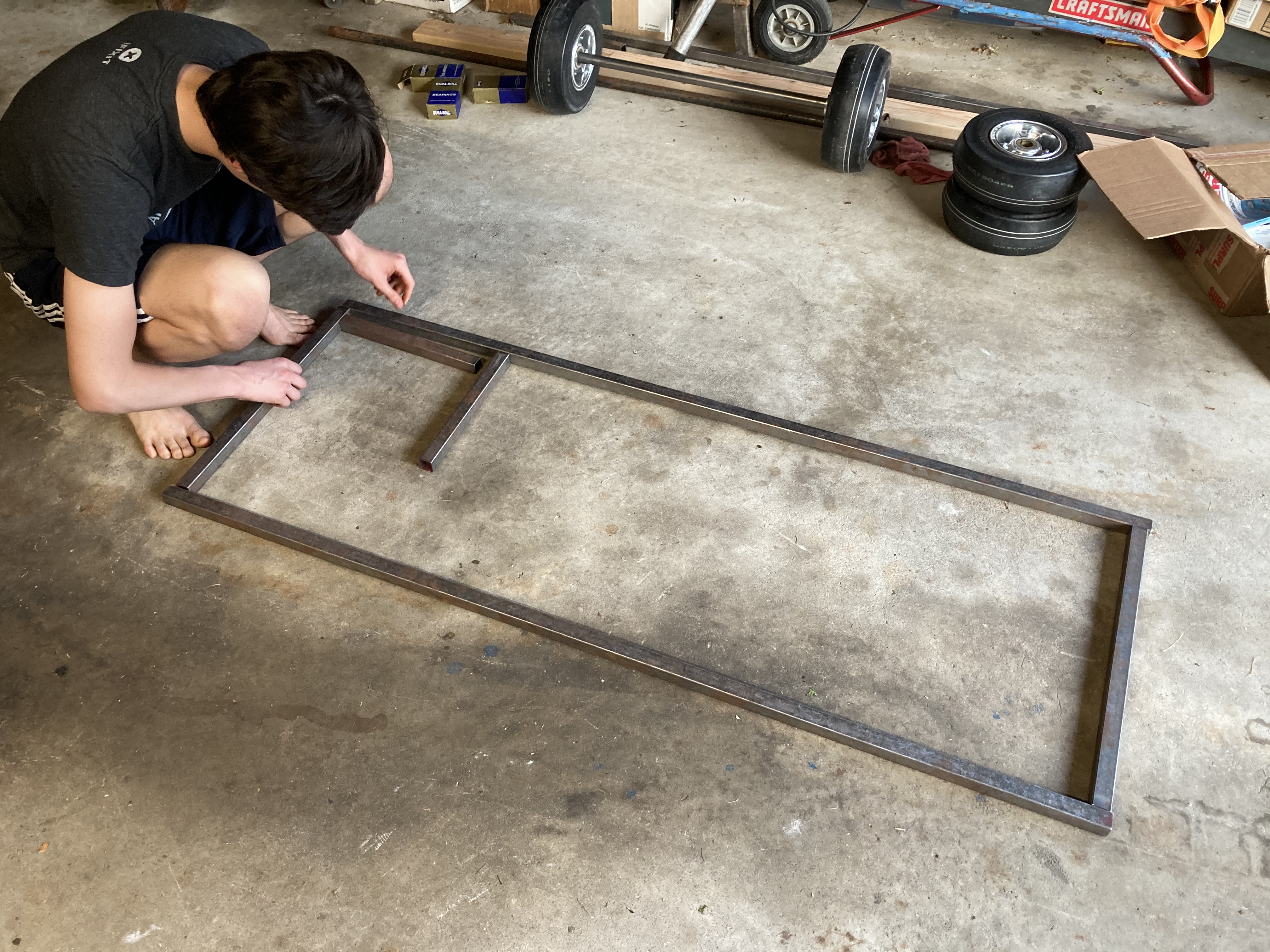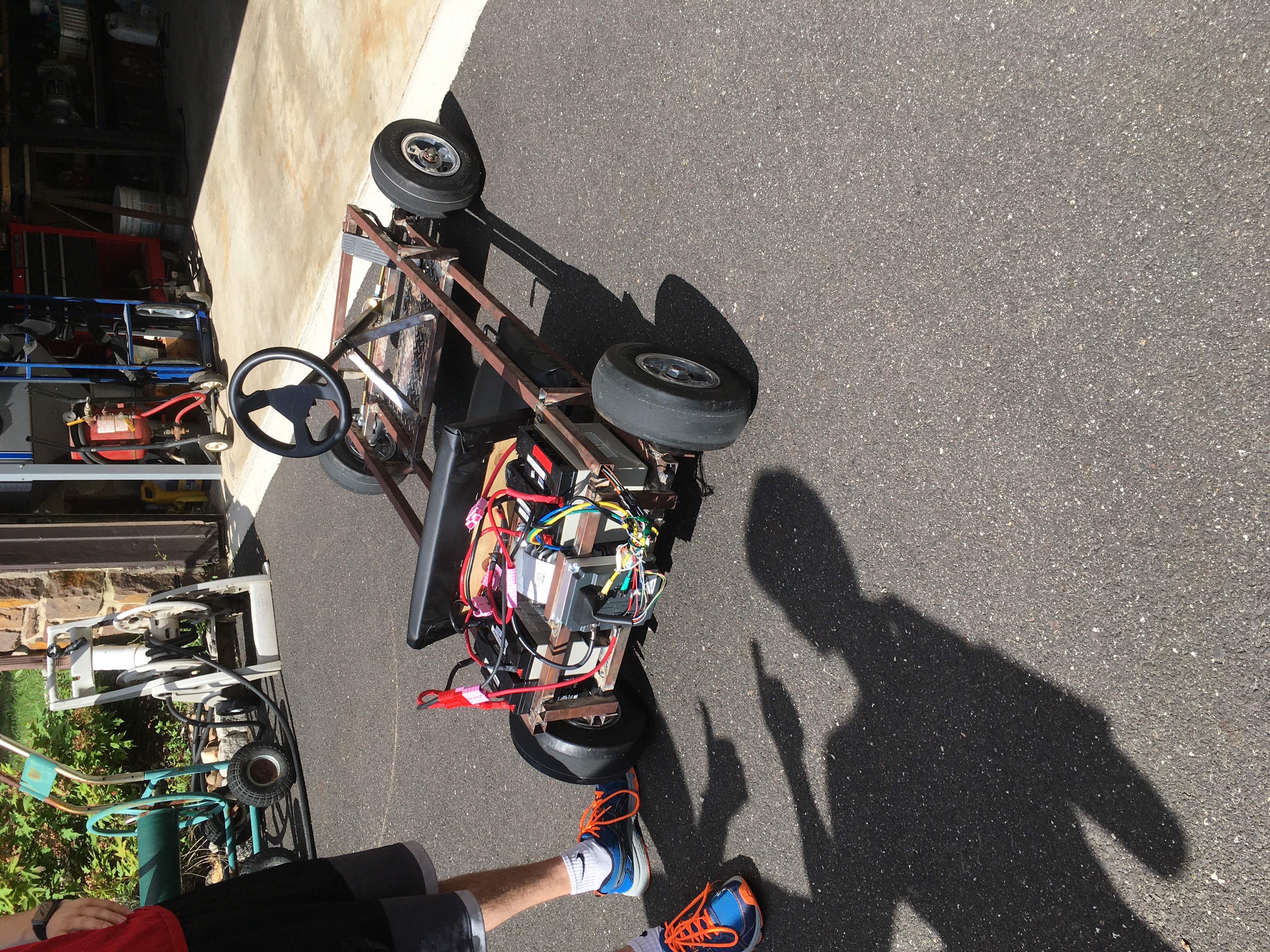 Along with a steering wheel from an old video game and a surplus pedal from BMW, we got a rolling chassis: