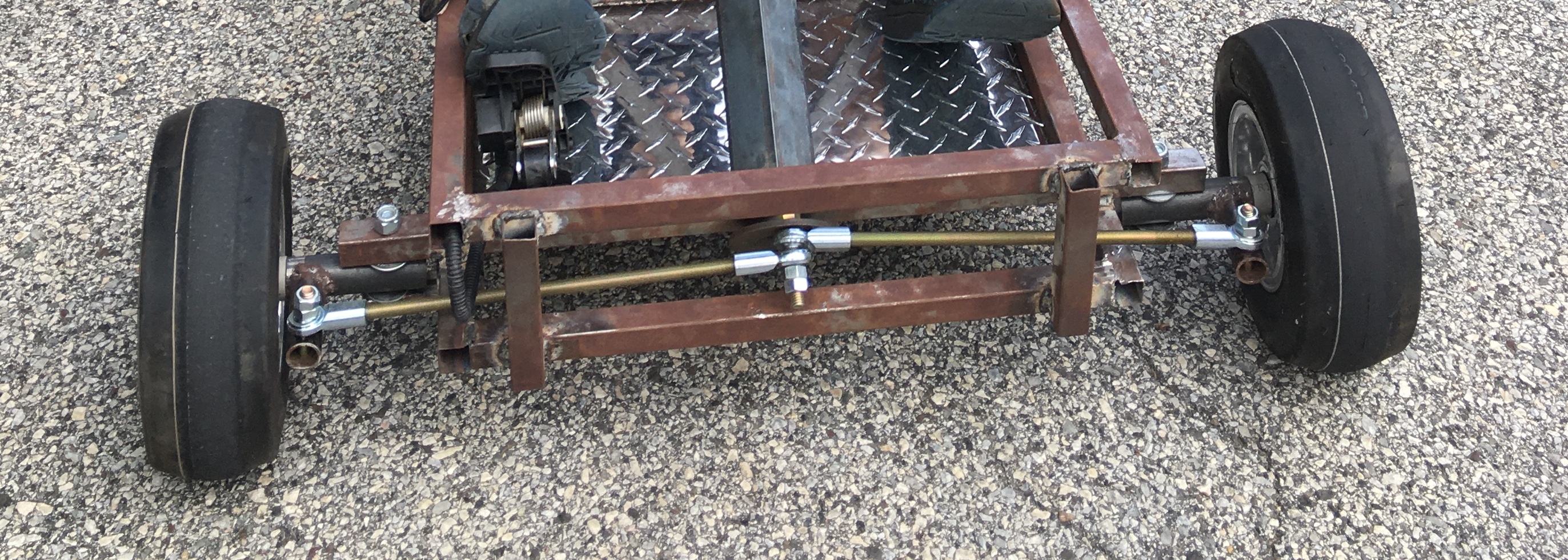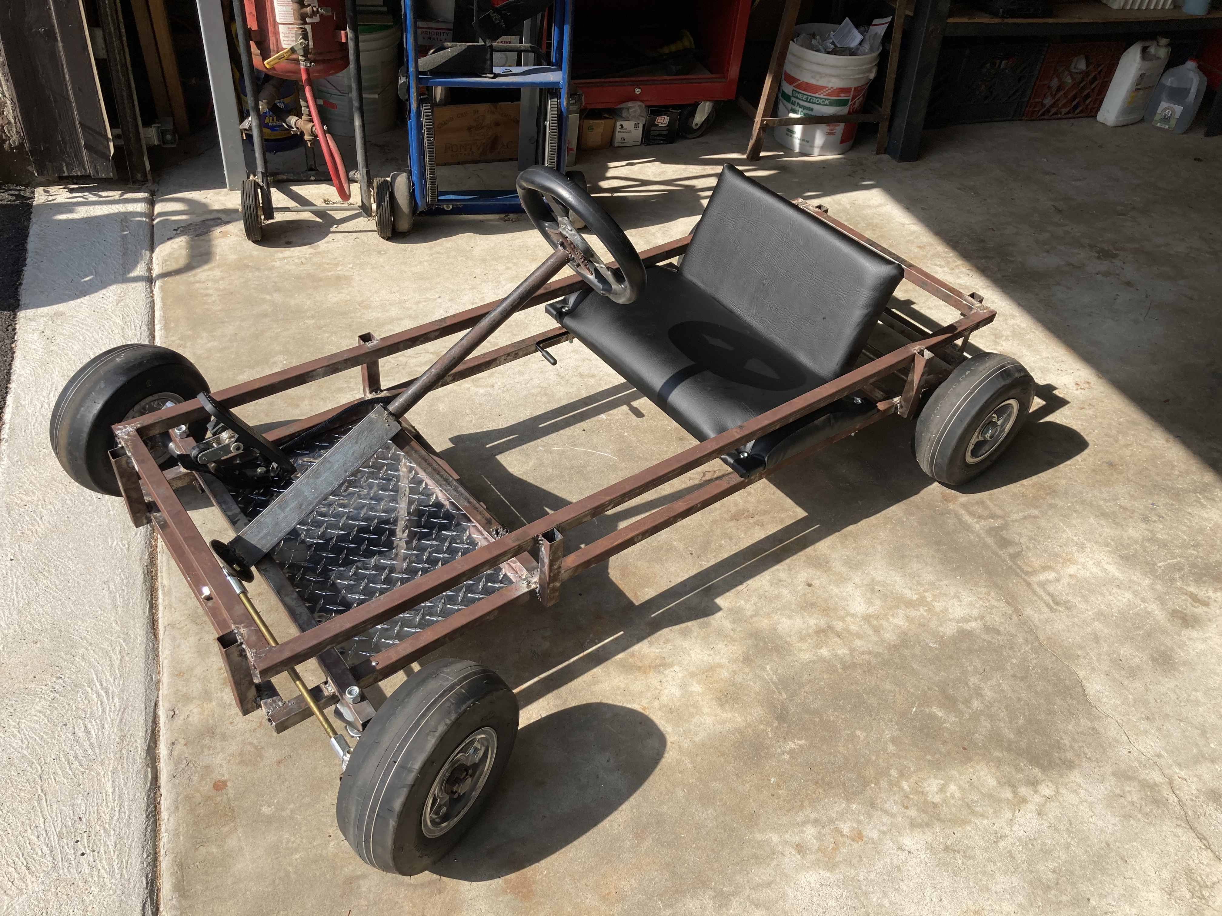 The seat is even adjustable. The steering column is a steel pipe terminated with a pipe flange, and the tie rods connect to one of its bolt holes.