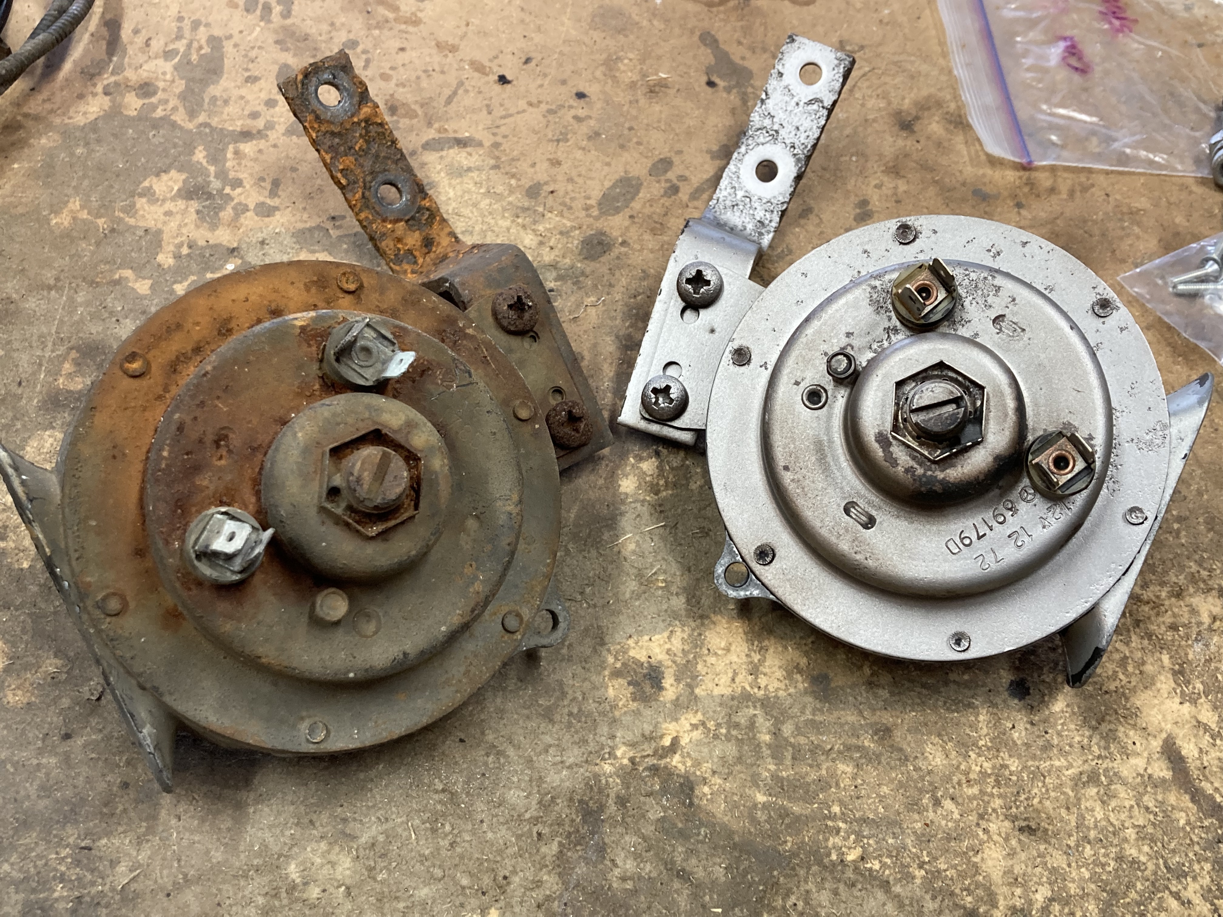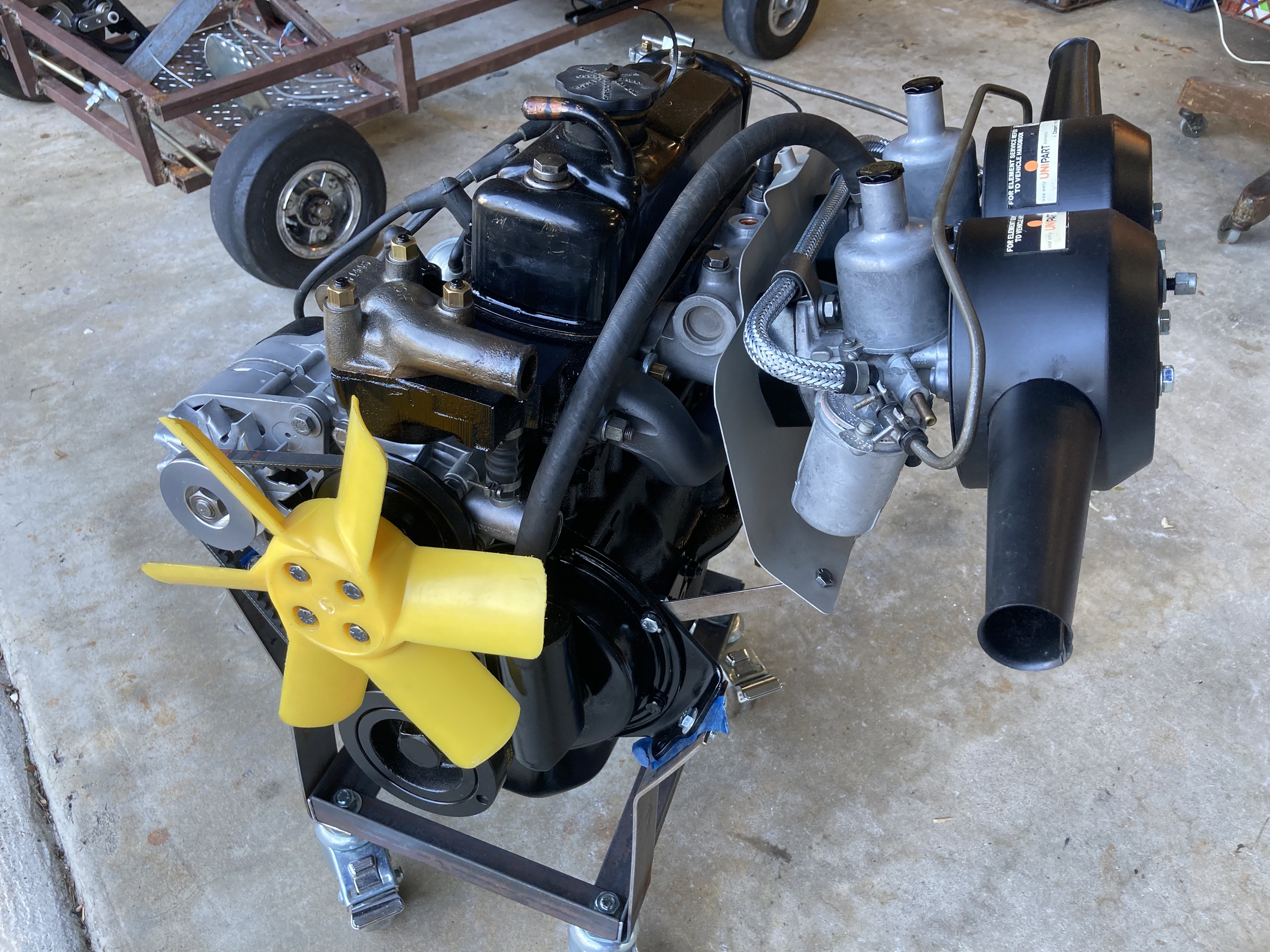 The repainted engine with ceramic-coated carb heat shield and exhaust header, the rebuilt front stub axles, and horns. Yes this tiny car has two horns.