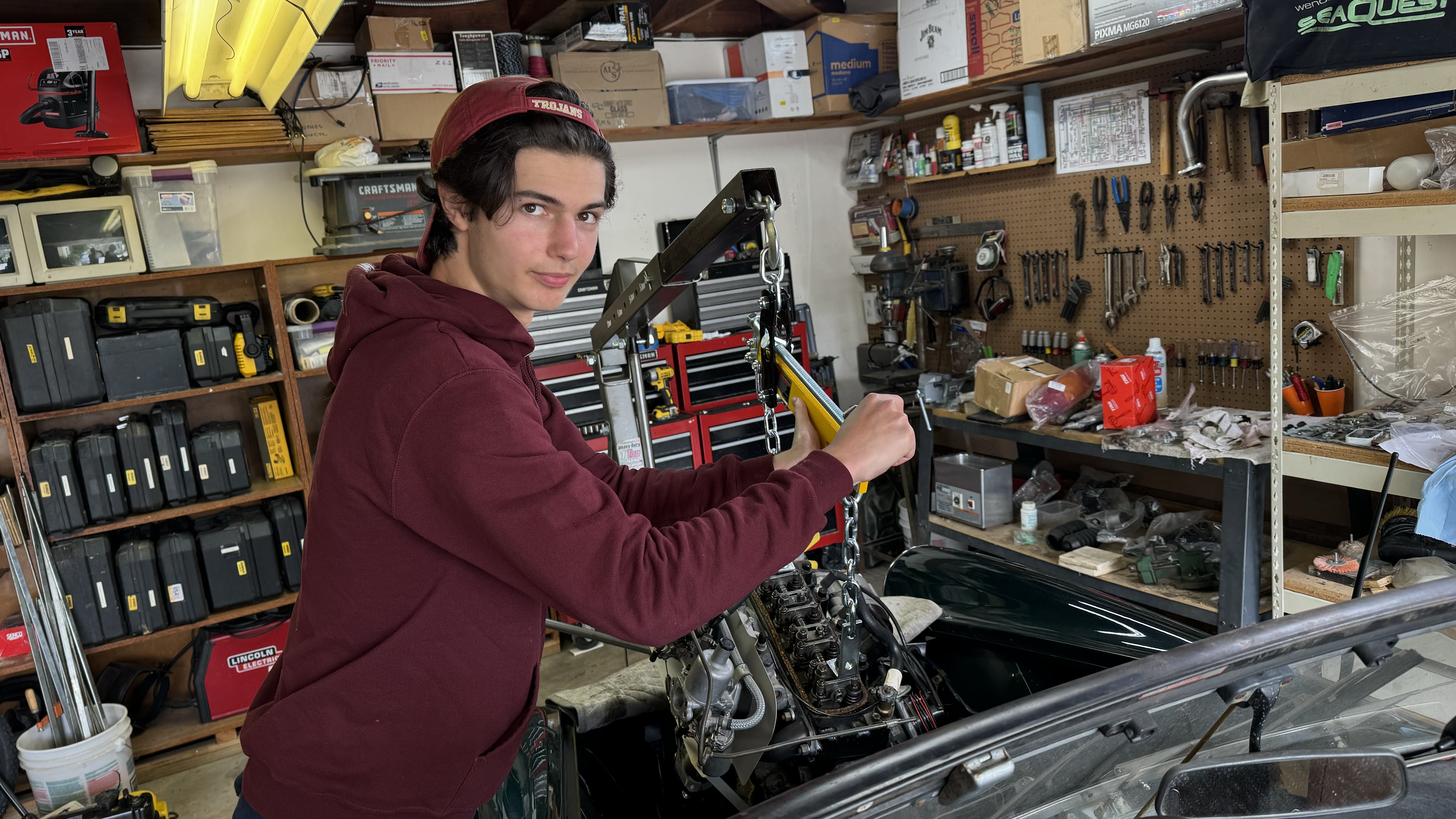 Before you put the engine back in, don't forget...everything. My son adjusts the tilt as the engine and transmission go back into the car after 30+ years.