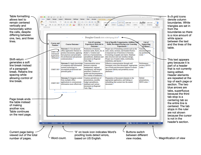 These documents were created as evidence of mastery for two parts of the Microsoft Office suite. The “x-ray” for Word takes on tables and formatting, and is a straightforward explanation of some of Word’s user interface along with the features in use on the page shown. There is also a bit of why (or why not) reasoning.