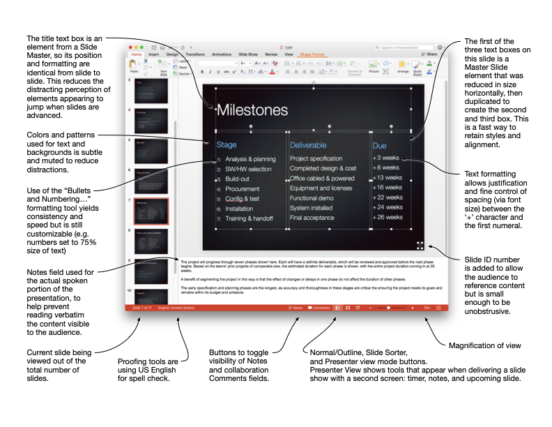 For the PowerPoint “x-ray” I added some tips on how to create a presentation, along with some editorializing on how to improve its delivery (see four of the five blurbs on the left).