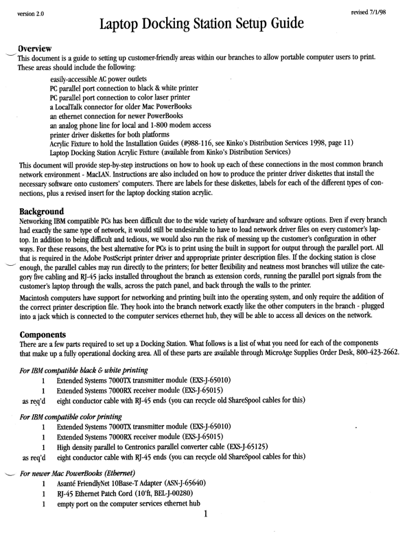Here is the full fledged Laptop Docking Station Setup Guide. It goes into more detail about the hardware and software requirements for Macs and PCs, a more in-depth discussion of the various methods of connection and cabling, tips for creating a comfortable docking area, and even a list of parts and part numbers.