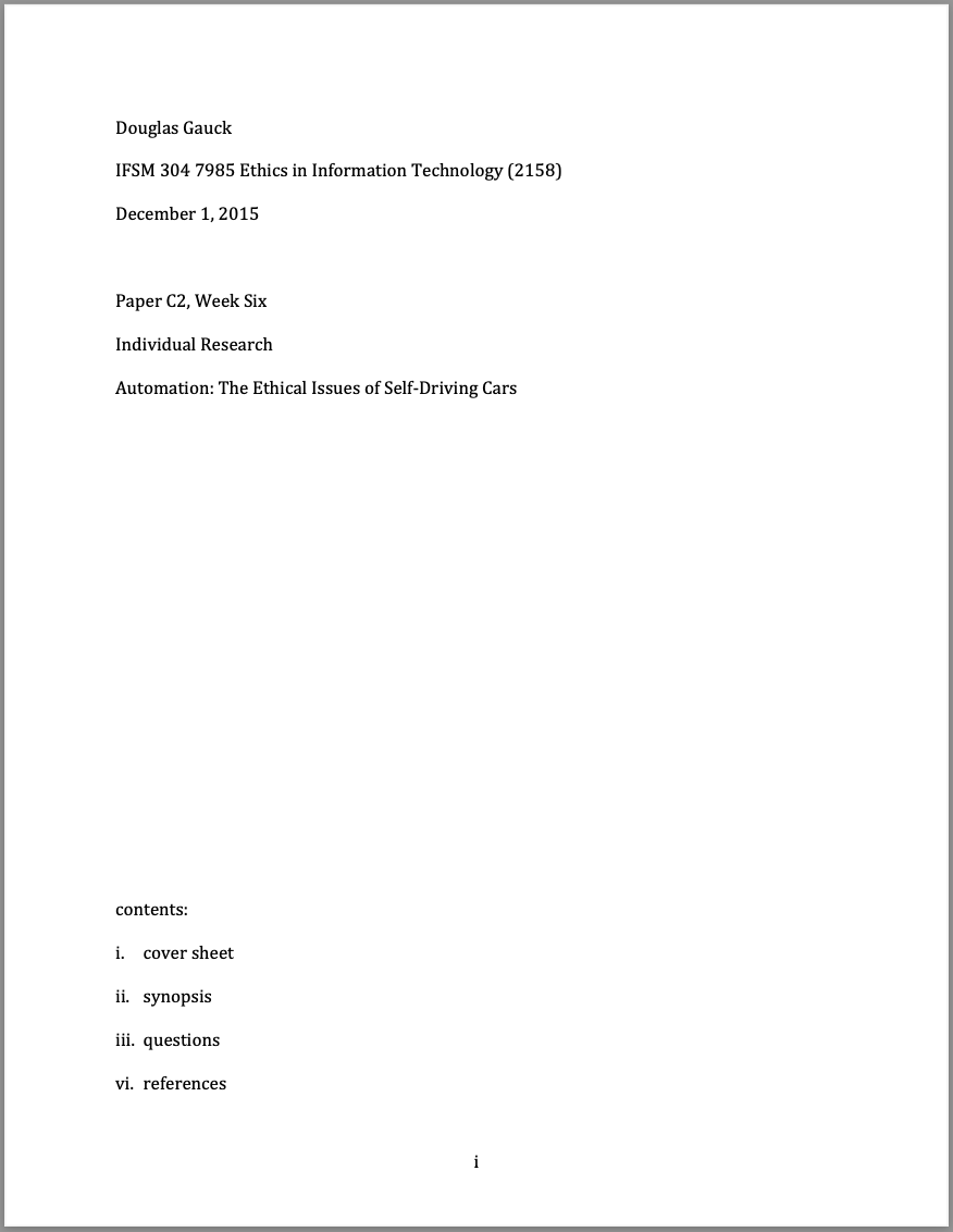 Finally, a brief analysis of the ethics of self-driving automobiles. This was written in 2015 as part of my undergraduate program.