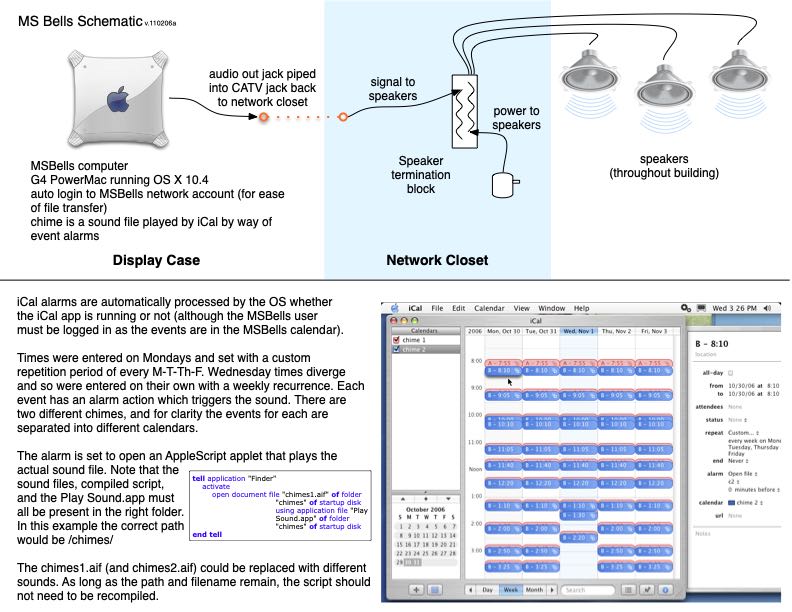 Another single page reference document that presents the entire computer-run bell system I designed. The top half is a schematic of the components of the system, where they are located and how they are connected and powered. The lower half is a kind of user guide, explaining that the bells are triggered by events in iCal and how the events were set up. The glue between the event and the generation of sound is explained, as well as how to change the sound of the bells.